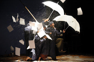 Ocho actores que multiplican los personajes y las sensaciones. Anoche estaba yo en el patio de butacas antes de que abrieran al público y los actores hacían su conjuro, su corro, su todos para uno y uno para todos de mosqueteros piratas que son. Al servicio de sus vidas, de sus vidas de náufragos piratas desahuciados por la vida.